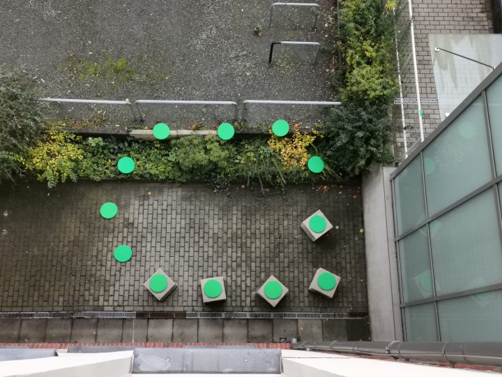 »Die Idee geht darauf zurück, dass man sich in Spanien bei politischen Versammlungen und Besprechungen auf öffentlichen Plätzen fast immer auf den Boden setzte, sich also erdet und auf die gleiche Ebene begab. Mir gefiel das sehr und ich fand es eine gute Ausgangssituation, um in unserer Gruppe über die Form des Zusammenkommens zu sprechen. Darüber hinaus können die greenscreenfarbenen Sitzkissen, wenn man dann tatsächlich in der digitalen Postproduktion die grüne Farbe selektiert und mit Schwarz ersetzt, zu Löchern im Boden werden, was wiederum den Anlass gibt, von dem katalanischen Philosophen Santiago Lopez Petit zu zitieren, der darüber schreibt, die Realität zu löchern. In unserem Fall die Realität mit Fragen zu löchern. So geben die Sitzkissen über ihren konkreten Nutzen hinaus Anlass, von ihnen ausgehend über anderes zu sprechen. Eine Schule bedeutet ja erst einmal auch ein Regelwerk, mit Stühlen, Tischen und Mauern, und allem was dazugehört. Wenn wir aber dieses Regelwerk als Konstrukt verstehen und befragen, können wir es auch verändern – vorausgesetzt. AUS: Interview: LERCHENFELD Magazin Nr. 56, 2020 »Die Realität mit Fragen löchern mit Anja Steidinger«