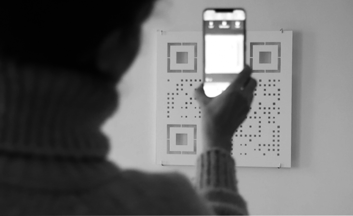 Sobald der QR-Code-Scanner des eigenen Handys über das weiße Gips-Relief aus quadratischen Leerstellen an der Wand fährt erscheint ein Bild im Display. Das Filmbild arbeitet sich durch Narrationsstrukturen und den (Macht-) Beziehungen der eigenen Geschichte. Es geht um die Lesbarkeit von Bewegt-Bild, Zeichen und versammelten Formen. In welcher Beziehung steht das schwarze Quadrat des QR-Codes mit einem Hubschrauberlandeplatz, Occupied Squares und der experimentellen Studie von Fritz Heider und Marianne Simmel?